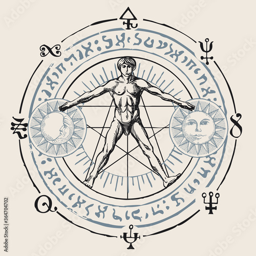 Illustration With A Human Figure Like Vitruvian Man By Leonardo Da Vinci Sun Moon And Alchemical Symbols Hand Drawn Banner With Esoteric And Magical Signs Written In A Circle In Retro Style