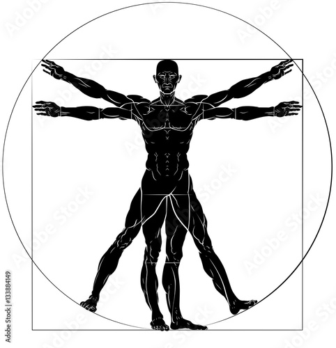 The man fits into a circle. It is accompanied by notes based on the work of the Roman architect Vitruvius.